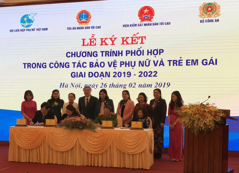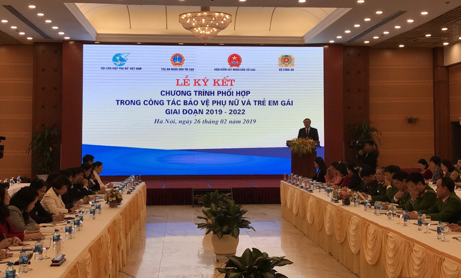 Chiều ngày 26/02/2019, tại Hà Nội đã tổ chức Lễ ký kết Chương trình phối hợp liên ngành trong công tác bảo vệ phụ nữ và trẻ em gái giai đoạn 2019 – 2022 giữa Trung ương Hội LHPN Việt Nam và Tòa án Nhân dân tối cao, Viện Kiểm sát Nhân dân tối cao, Bộ Công an.