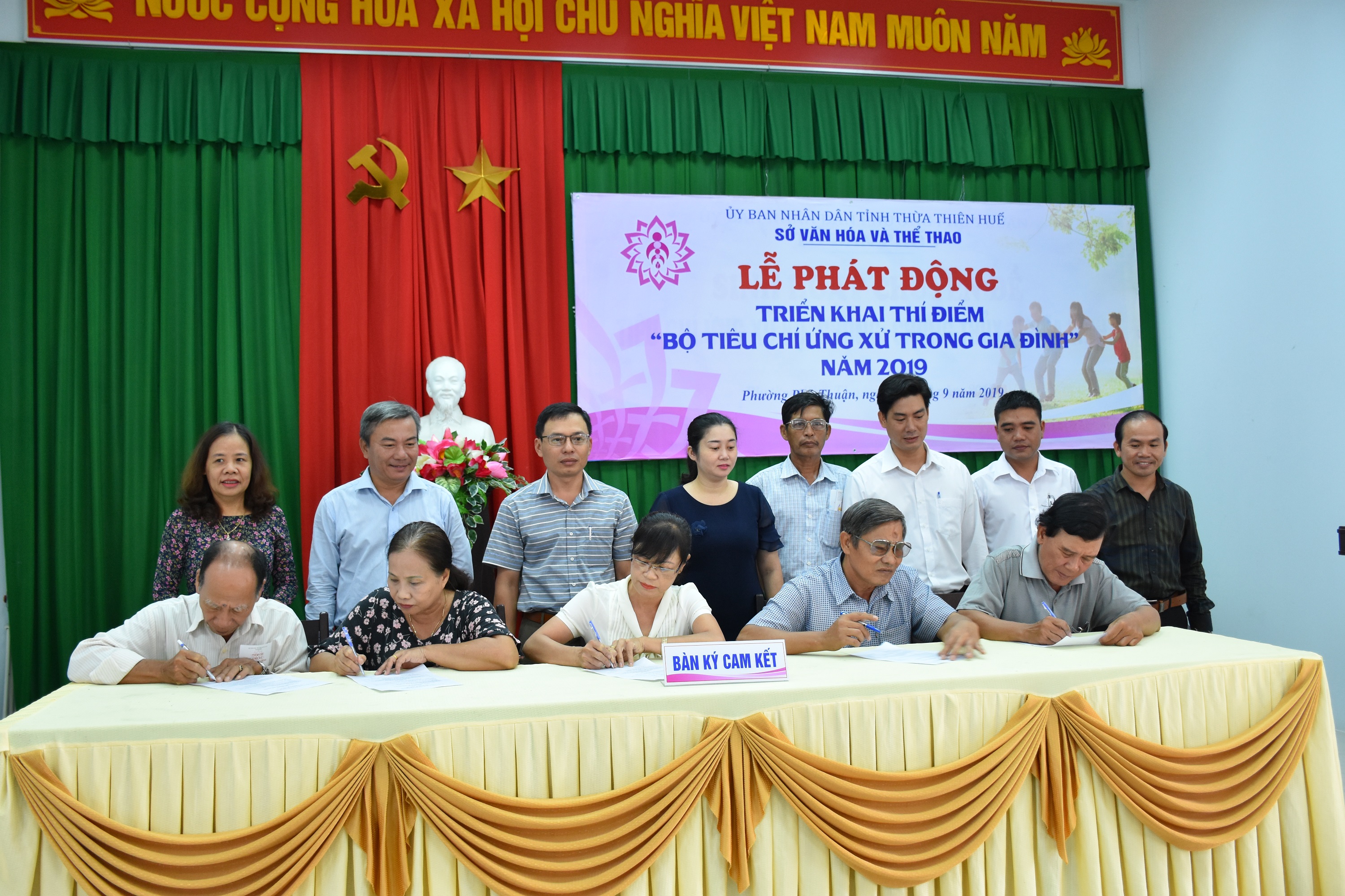 Tỉnh Thừa Thiên Huế là một trong những địa phương được Bộ Văn hóa, Thể thao và Du lịch chọn triển khai thí điểm Bộ tiêu chí này. Qua thống nhất của Ban tổ chức địa phương, Sở Văn hóa và Thể thao chọn thôn Bồ Hòn, xã Bình Thành, thị xã Hương Trà là địa phương đại diện cho khu vực miền núi của tỉnh và tổ dân phố 7, phường Phú Thuận, thành phố Huế đại diện vùng đồng bằng để triển khai thí điểm thực hiện Bộ tiêu chí ứng xử trong gia đình.